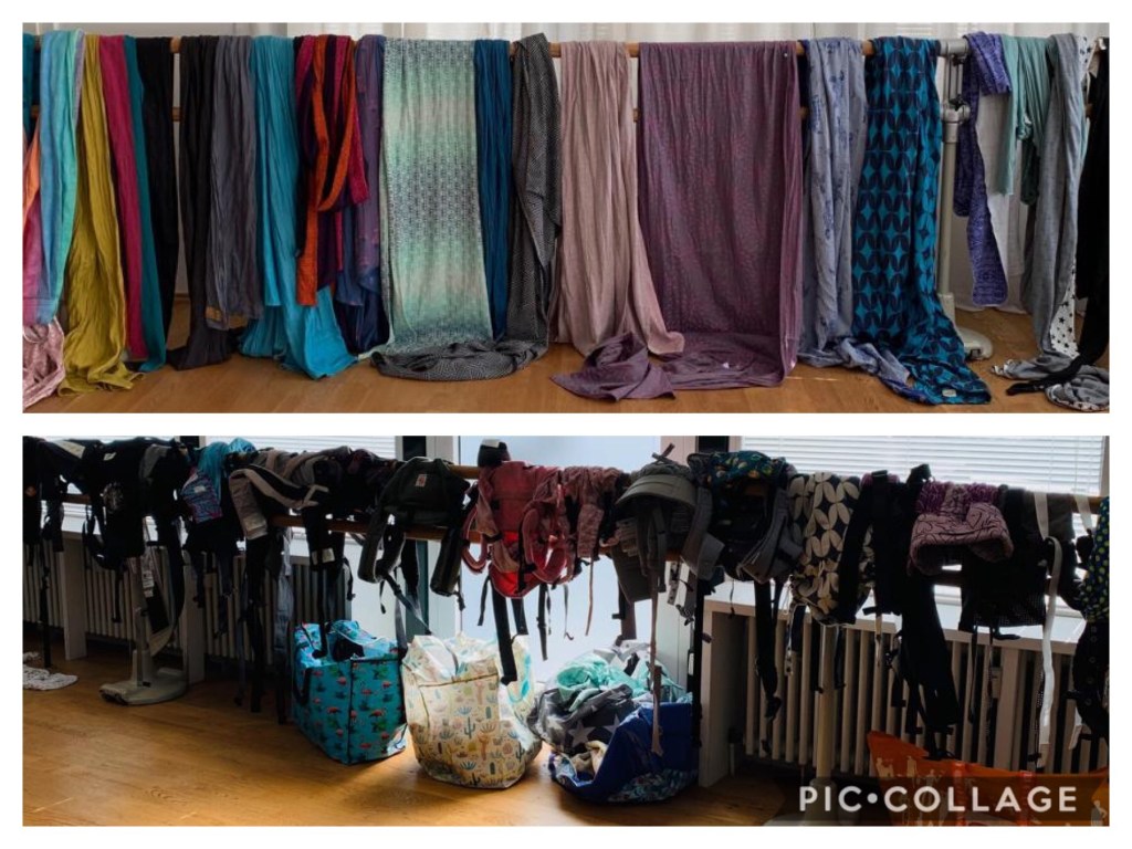 Die Vielfalt ist groß im „Trage-Dschungel“ – wie das Foto aus der Ausbildung zeigt. Ich zeige euch gerne grundlegende Bindeweisen mit dem Tragetuch (gewebt od. elastisch) sowie das Anlegen eines Ringslings. Für „Tragehilfen“ haben ich einen Faible – egal ob Fullbuckle, MeiTai oder WrapCon.
